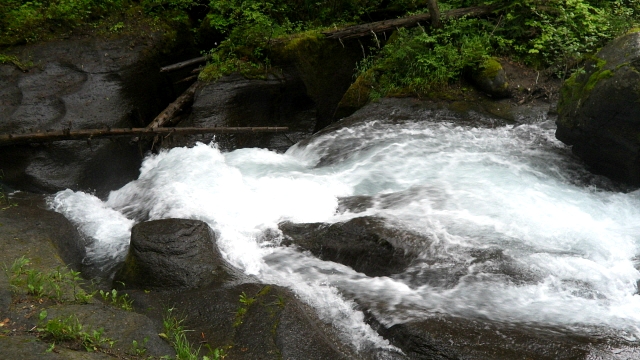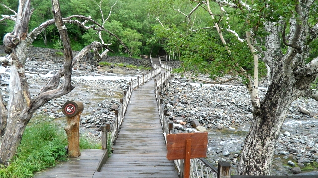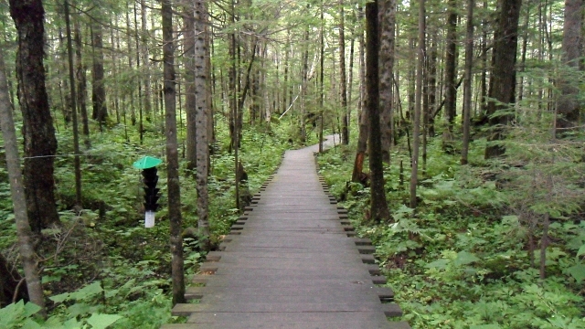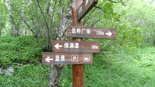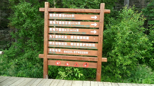 14:30 환승 주차장 건너편 계곡쪽을 보니 이정표가 서 있다[洞天瀑布 2,320m, 地下森林 입구 3,670m]. 숙소로 돌아가는 버스가 17시에 출발하기로 되어 있으니 이 길을 따라 걸어가도 시간이 충분해 보인다. 숲길로 들어섰다. 물소리 요란한 백두산의 숲길을 걷는 정취가 기분을 좋게 한다. 그런데 시간이 갈수록 마음이 다급해진다. 걷는 길이 흙길이 아니라 나무로 만든 길인데 아침까지 내린 비로 너무 미끄러워 속도가 전혀 나지 않는다. 그런데 동행한 부부는 나의 조급함을 아는지 모르는지……