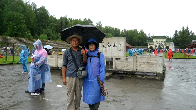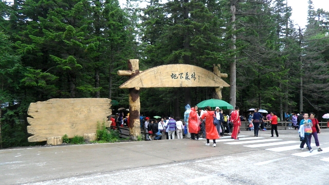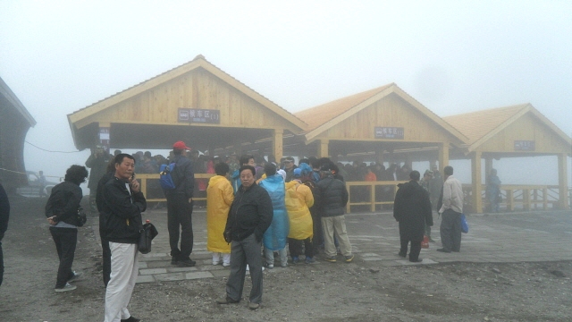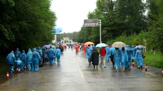 07:50 북파 산문 주차장에 도착했는데 비가 계속 내린다. 모두 우의를 꺼내 걸치고 산문으로 간다. 수많은 사람들이 백두산에 가려고 산문으로 가는데 입장권은 바로 살 수 있었다. 정문을 지나 안으로 들어서니 셔틀버스를 타려는 사람들의 긴 행렬이 기다리고 있었다. 파랗고 노란 우의를 입은 긴 행렬이............