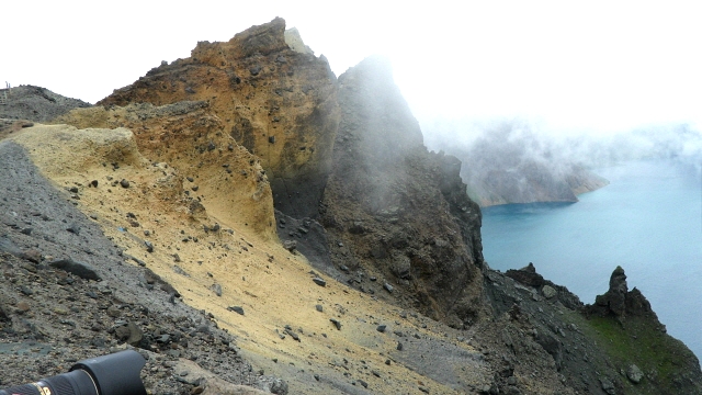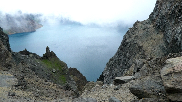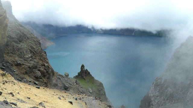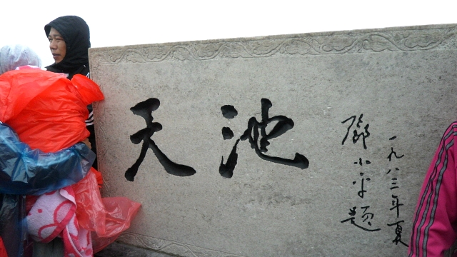 12:39-13:20 기적같이 천지가 활짝 열렸다. 주변의 봉우리는 보이지 않았지만 천지의 전 모습이 눈에 들어왔다. 그곳에 서있던 사람들의 함성이 터져 나왔다. 그리고는 잠시 후에 다시 닫혀버린다. 그곳에 있던 40여분 동안 세 번 천지의 모습을 보여주었다. 목포대 부부와는 2시에 편의점에서 만나기로 하였다.