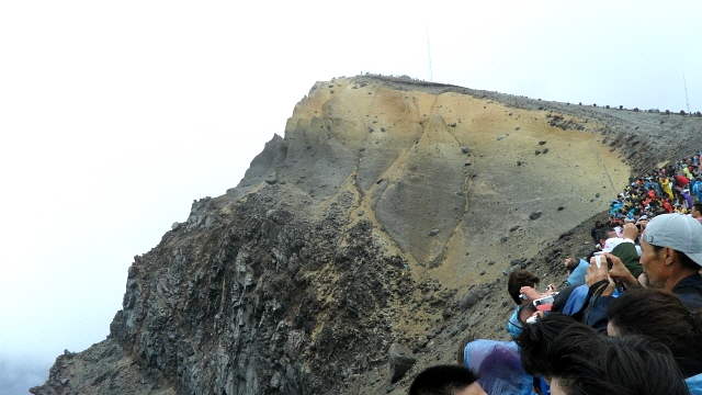 12:05 천문봉 아래를 지나 천지가 보인다는 곳에 갔으나 보이는 것은 안개요, 가까이 서 있는 사람들뿐이다. 일단 편의점이 있는 곳으로 돌아와 시간을 기다려보기로 했다. 편의점에는 사람들로 가득 차 있다. 점심때도 되고 허기도 지기에 일단 컵라면을 하나씩 먹으며 내가 가지고 간 소주를 한 모금씩 마셨다. 갑자기 밖이 훤해지는 느낌이 든다. 다시 가보자고 했다.